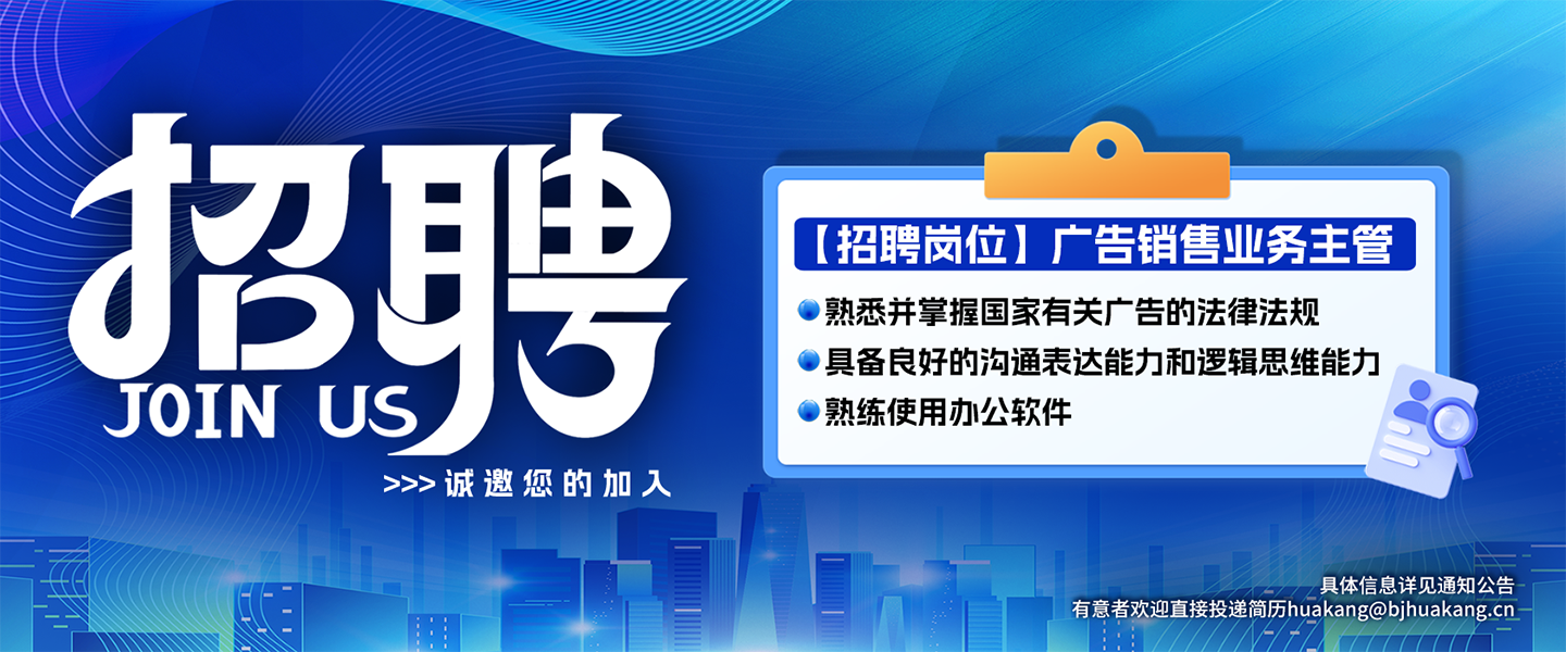 现因业务发展需要,招聘广告销售业务主管1名。工作地点:北京市西城区东河沿大街69号,有意者欢迎直接投递简历huakang@bjhuakang.cn